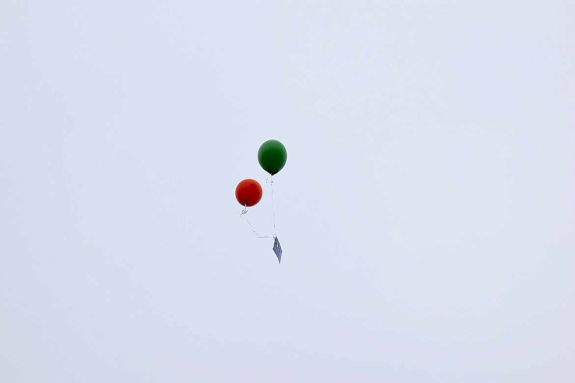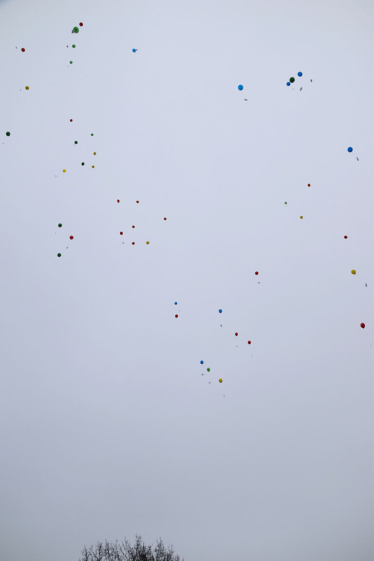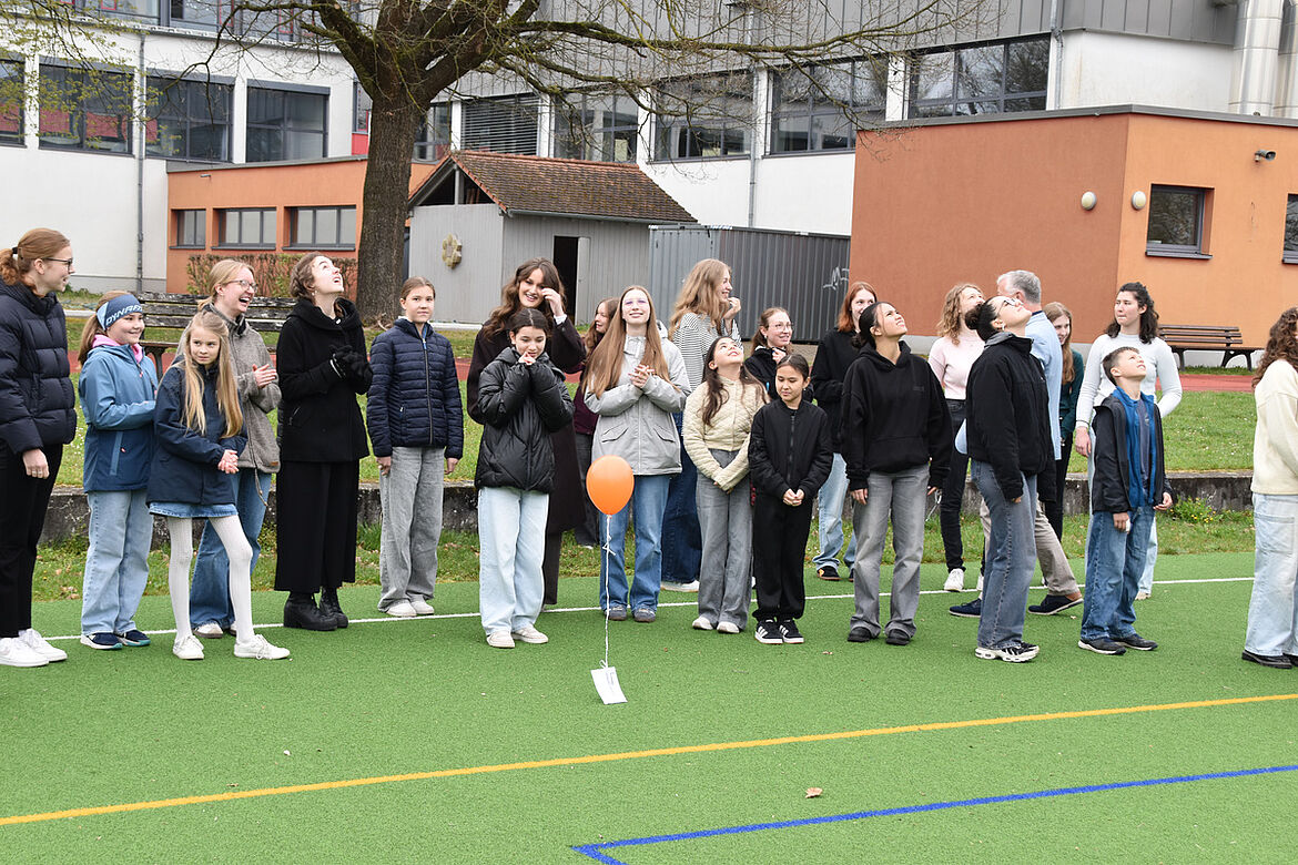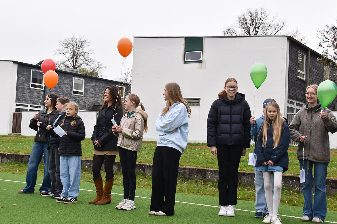Nachdem Oberstufenkoordinator Herr Kraft die Aktion eröffnet hat, lassen Klein und Groß, Hand in Hand, die Heliumballons mit Wunschkarten in den Himmel steigen, um den Zusammenhalt angesichts der anstehenden Abschlussprüfungen zu feiern.