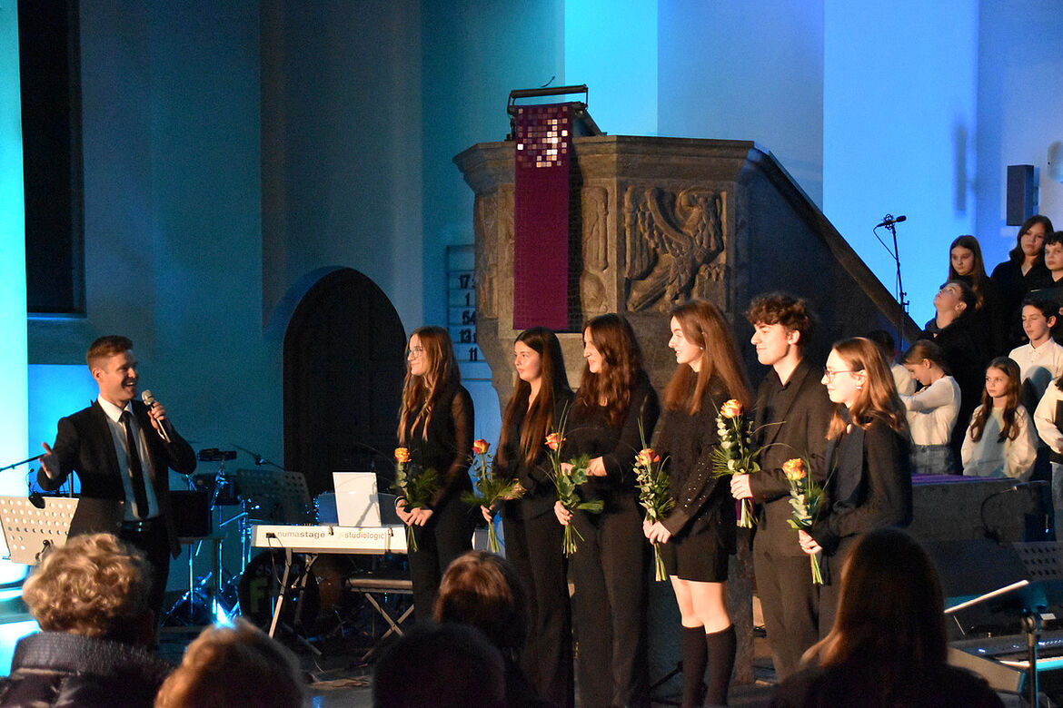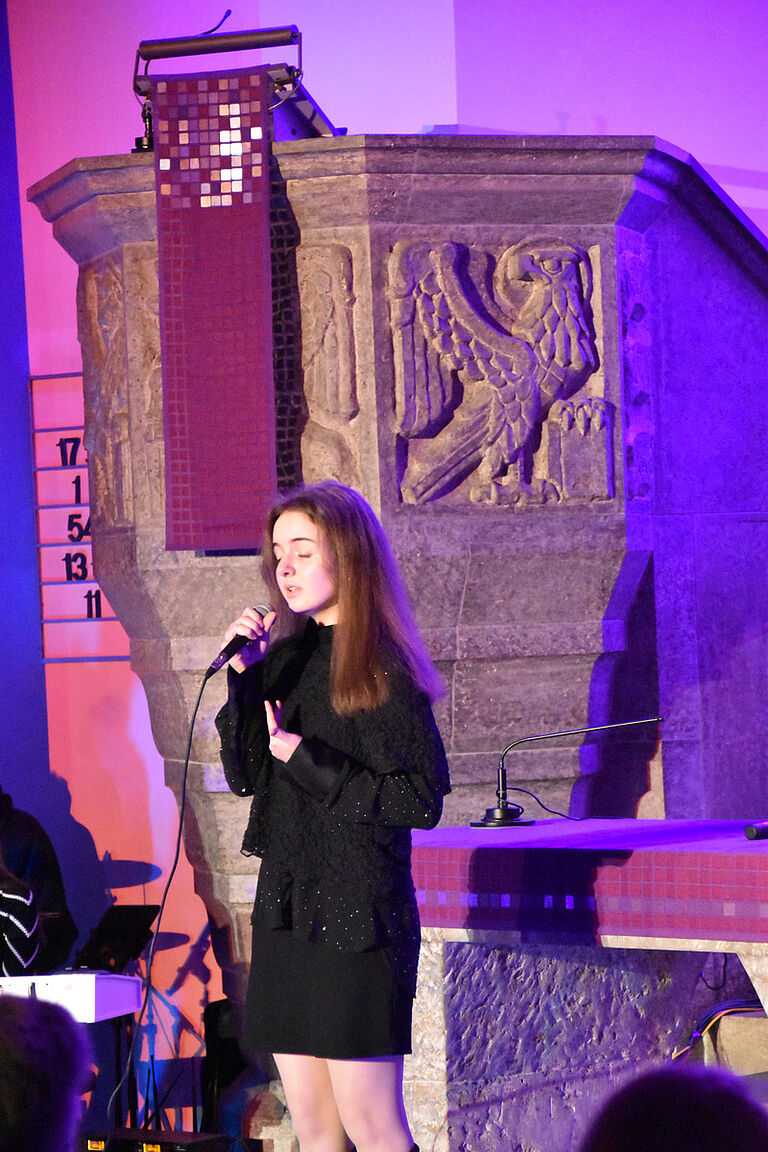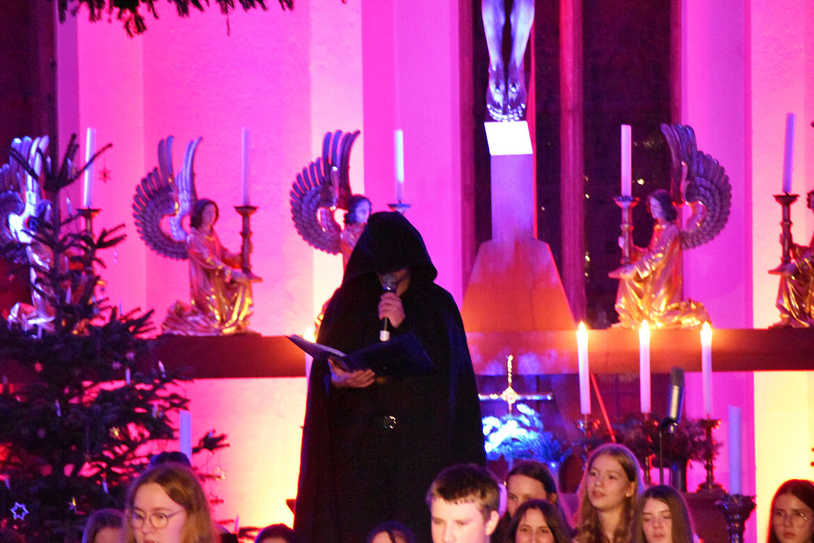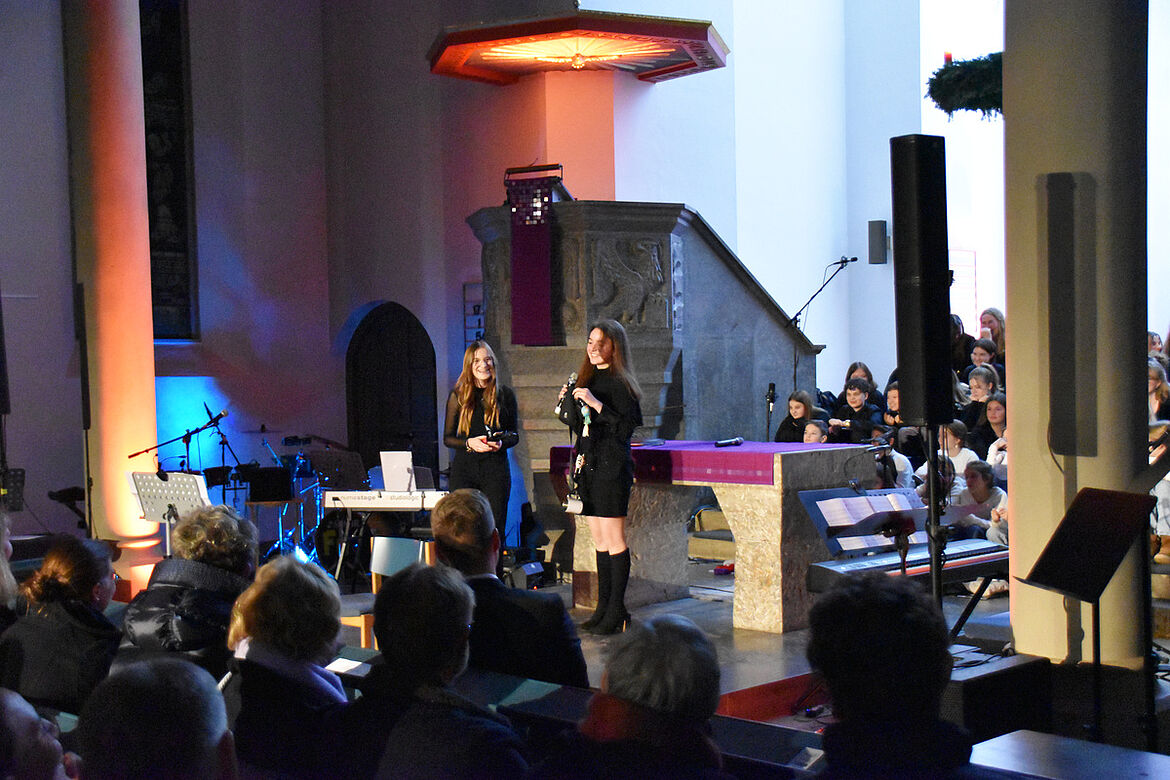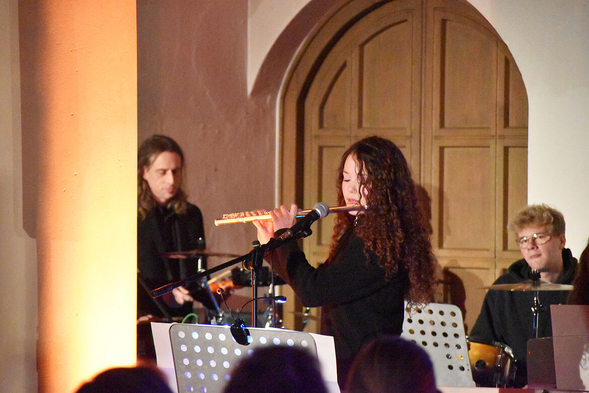 Für mitreißende Kontraste sorgte die Schulband, die gleich zweimal auf der Bühne stand. Mit einem Song von Kelly Clarkson präsentierte sie sich herrlich weihnachtlich, doch vor allem mit einer Eigenkomposition setzte die Band ein starkes Zeichen. Gerade die junge Frontsängerin Sarah überzeugte mit zielsicherem Ausdruck und einer überraschend lebendigen Bühnenpräsenz, getragen von einem kraftvollen Schlagzeug und Basslinie, die dem Gesamtklang Tiefe verliehen: Ein Auftritt, der in Erinnerung bleibt.