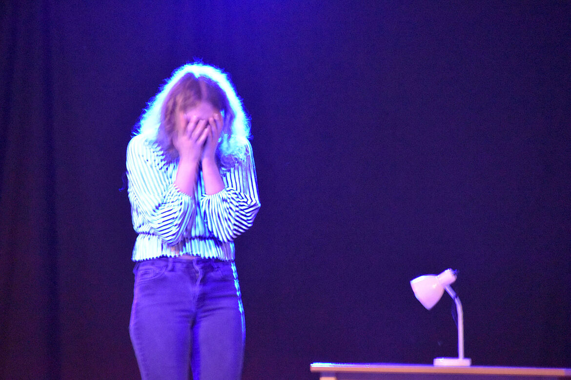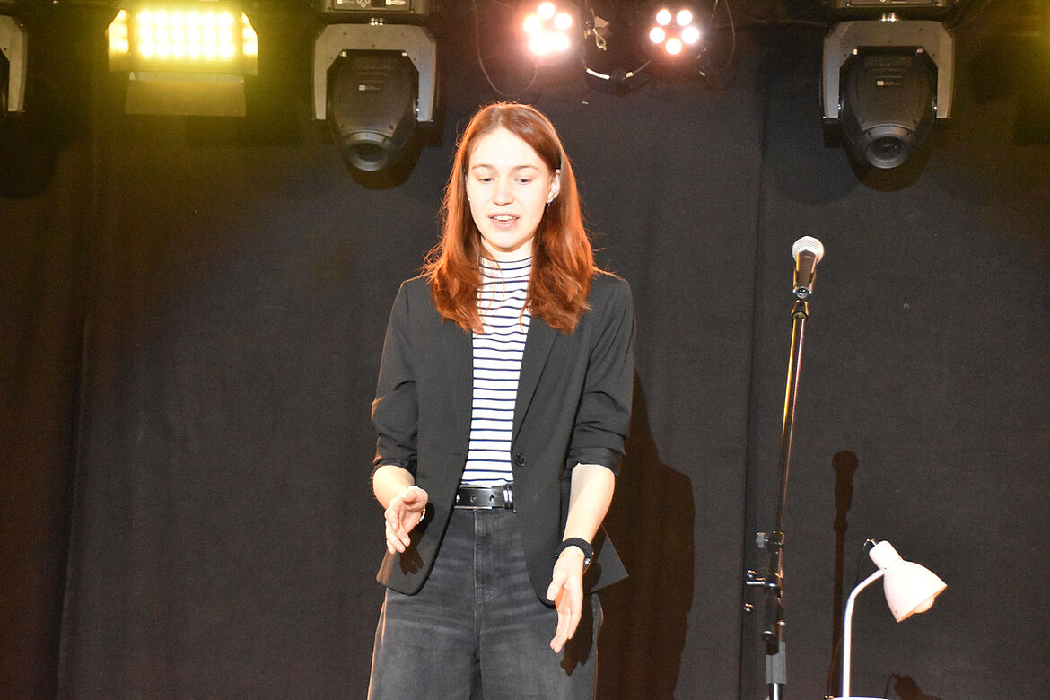 In der zweiten Hälfte nimmt das Stück so richtig Fahrt auf und besonders eindrucksvoll ist Emilias Poetry-Slam-Monolog „Verdrängen ist mein Lieblingsspiel“, geschrieben und großartig vorgetragen von Rebecca, ein sprachlich dichter, rhythmisch präziser Text über Perfektionismus und Selbstbetrug. Das Publikum erlebt Wellen aus Lebensplanung, Leere, Druck und innerer Anklage – ein Kunstwerk aus Sprache.