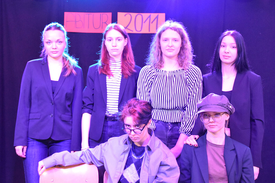 Aurora bleibt als Tote präsent: Ihr unerfüllter Wunsch, „wegzugehen, echte Freunde zu finden“, scheiterte an den Ereignissen und dem Verhalten ihrer MitschülerInnen und deren klar konturierten Rollen. Das spürt man auch auf dem geschickt gedruckten Programmheft: Es zeigt ein Foto der Ehemaligen im Vergleich, 2011 samt lachender Aurora, 2026 ist ihr Stuhl leer und die Blicke der Ehemaligen ebenso.